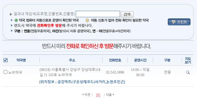 사이트에 들어가면 '휴일지킴이 약국', '연중무휴약국', '심야약국'으로 구분이 되어 조회를 할 수 있게 되어 있습니다.
